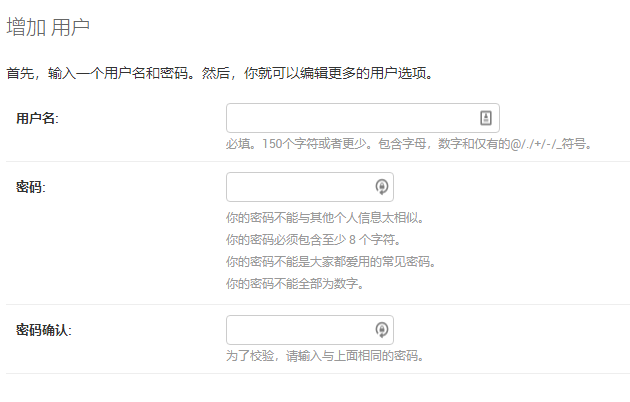 在 Auth 下有用户一项,点击添加按钮进入添加界面,还挺复杂的。在这里提示是黑体的字段是必输项,其实只有两项是需要我们输的:用户名和密码。用户名好办,密码有一些复杂度的要求: