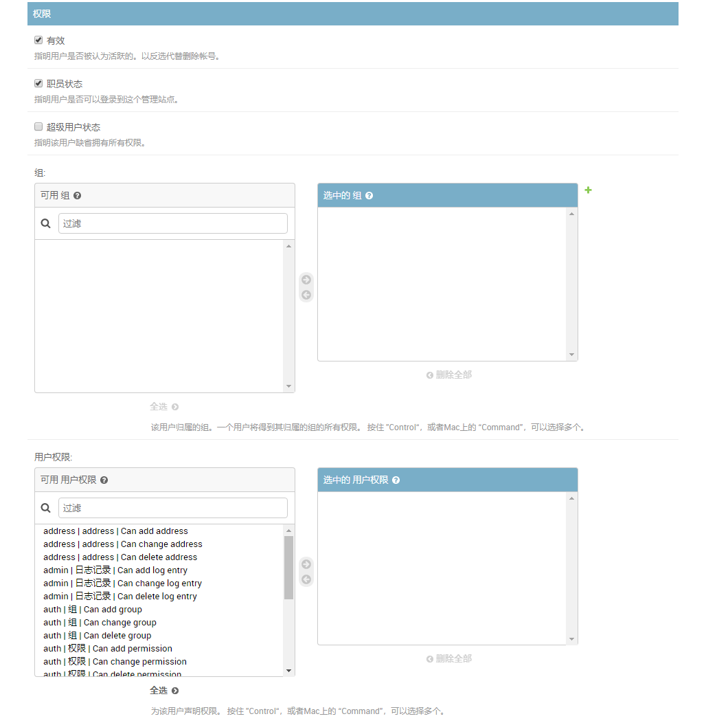 注意,职员状态检查框如果不打勾,则你的用户也无法使用,因为他不能登录。也许你担心,如果打勾了,那不是他就能做好多事了吗?其实不然。在 Django 中,创建一个 app 之后都有一些基本的权限会自动生成,而这些除了超级用户,它们是不会自动赋给某个用户的。因此如果管理员不给某个用户关于 app 的使用权限,那么这个用户根本没有办法操纵这些 app ,甚至连看都看不到(大家自已试一下就知道了)。这样他能够做的只是登录,但这也许就够了,有时我们需要的就是一个用户的合法身份,而不是一定要他能做些什么。